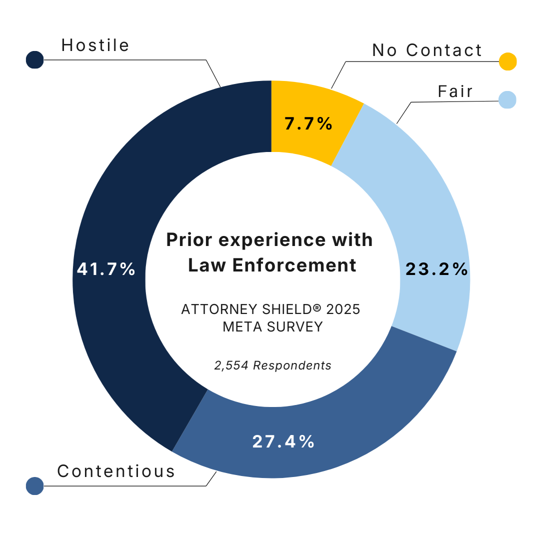 Attorney Shield recently conducted a survey on Meta asking respondents to select the option that best described their prior experience with law enforcement. A total of 2,554 responses were collected, producing the following distribution: